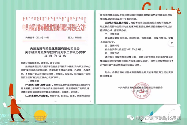 內(nèi)蒙古雅布賴鹽化集團(tuán)有限公司自黨史學(xué)習(xí)教育啟動(dòng)以來,始終把謀劃開展好黨史學(xué)習(xí)教育作為一項(xiàng)重大政治任務(wù),以高度的政治責(zé)任感和強(qiáng)烈的政治擔(dān)當(dāng)迅速行動(dòng)、主動(dòng)作為,緊緊圍繞“學(xué)黨史、悟思想、辦實(shí)事、開新局”的目標(biāo)要求,多措并舉抓緊抓實(shí)黨史學(xué)習(xí)教育,確保了公司黨史學(xué)習(xí)教育高起點(diǎn)開局、高質(zhì)量推進(jìn)。